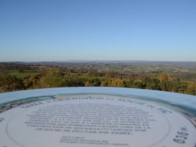 In Allassac, the Roche site offers one of the most breathtaking panoramas over the Vézère gorges. A short walk along a fern-lined path leads you to an orientation table shaded by oak and chestnut trees, perched at 391 metres. From here, the sweeping views extend over the gorge valley and the surrounding plateaus.